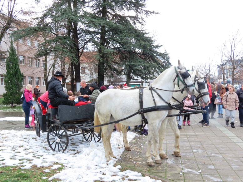 На платоу испред Основне школе „Мика Митровић“ малишани су направили велику веселу журку. Играли су, певали, рецитовали и са Деда Мразом се возили фијакером.