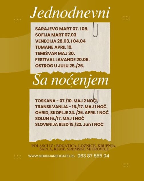 Са дугогодишњим искуством и јасним фокусом на квалитет услуге, Меридијан Богатић и овог пролећа потврђује статус поузданог партнера за путовања. Детаљне информације, резервације и комплетна понуда доступни су на званичном сајту агенције meridijanbogatic.rs.